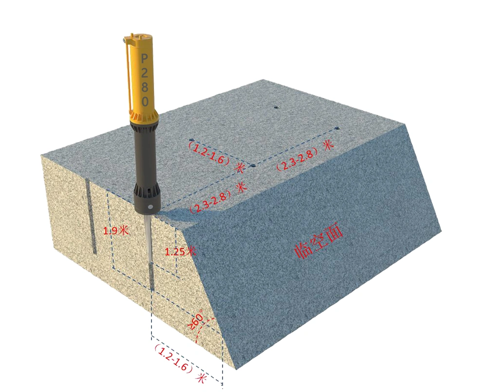 The excavator-mounted splitter is optimized for a Ø135mm borehole diameter with a 2-meter drilling depth capacity. By maintaining a hole spacing of 1600-1800mm, the splitter achieves an ideal balance between fragmentation effectiveness and overall construction efficiency.