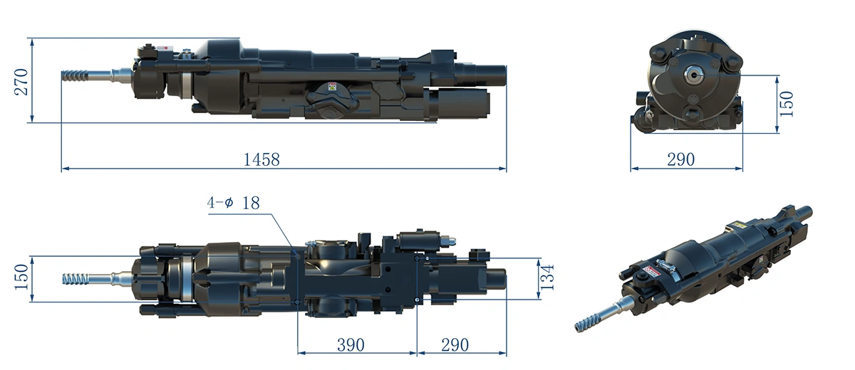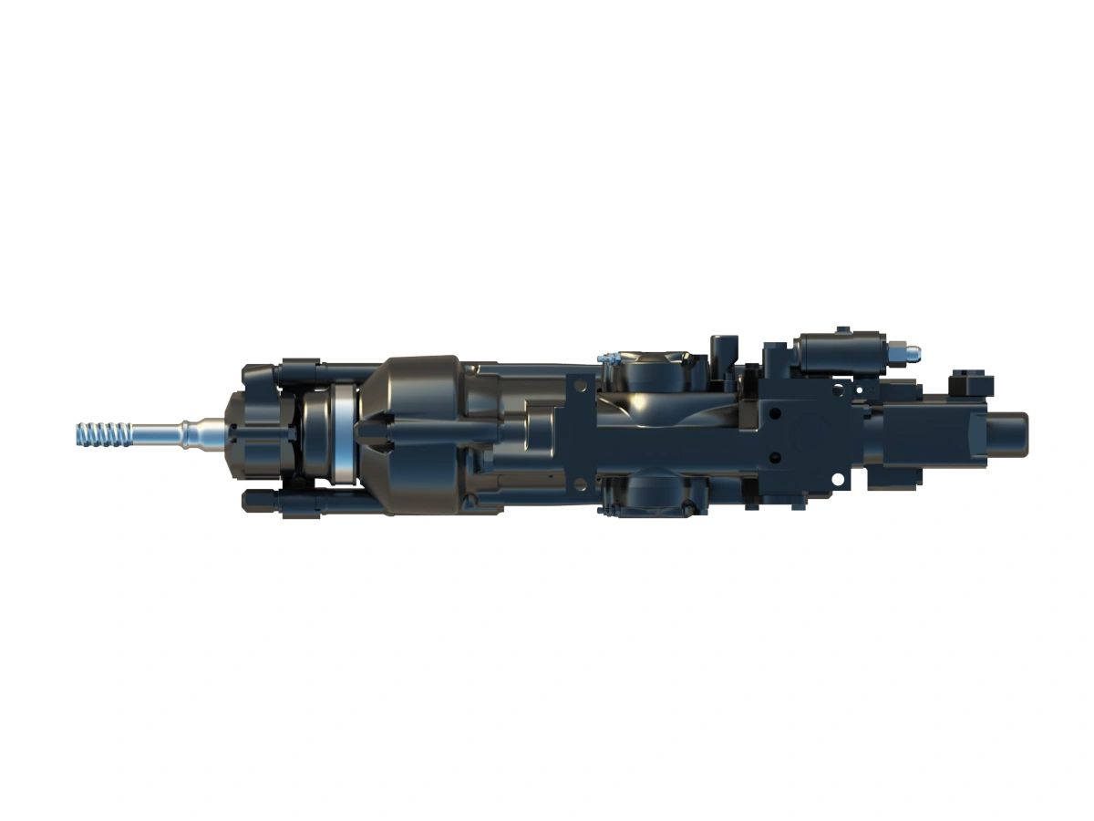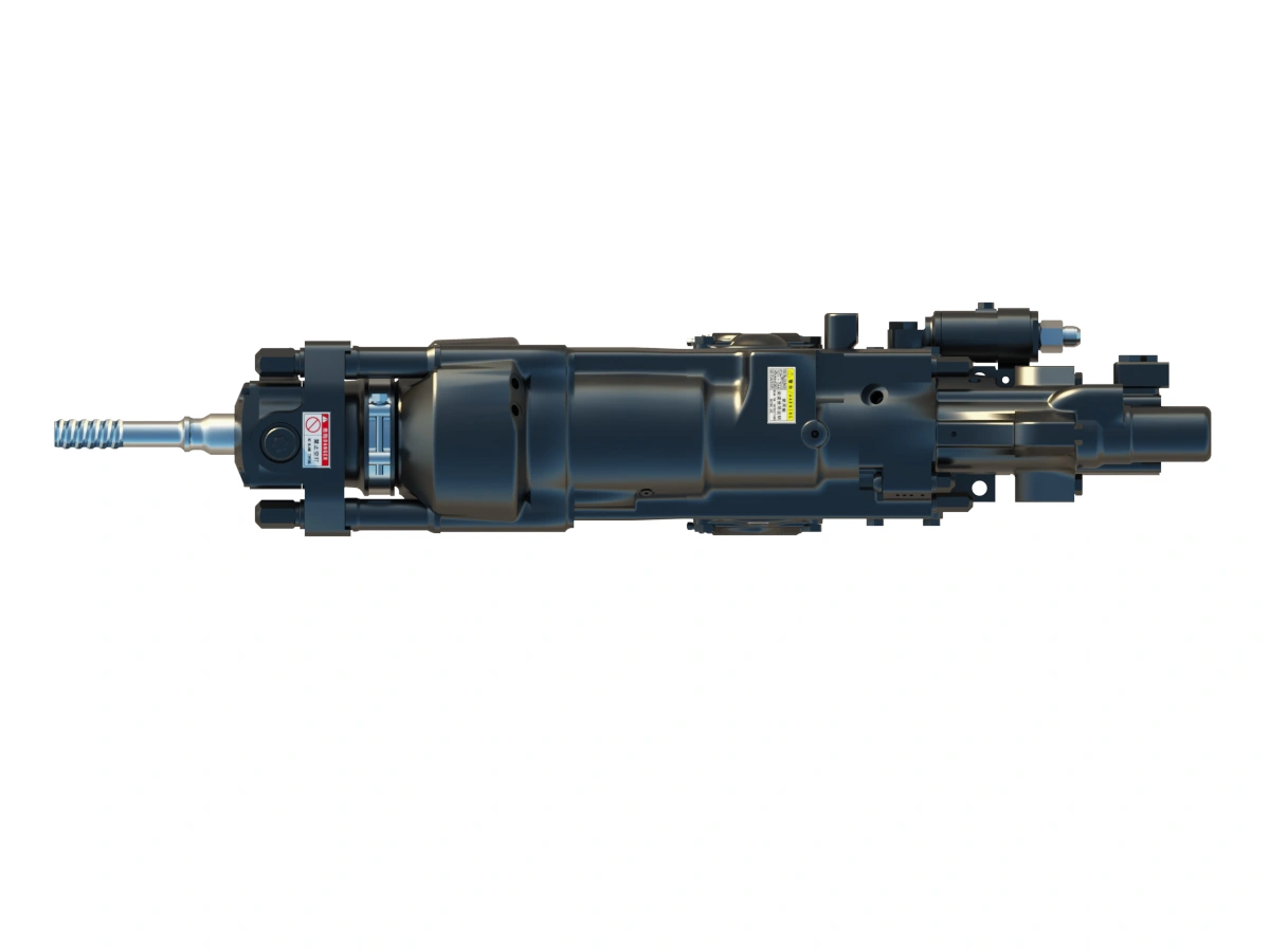 The 1838MUX hydraulic rock drill is designed with an efficient hydraulic double damping system that utilizes floating adapter technology to deliver high productivity and excellent drill steel economy. The hydraulic drifter is equipped with a powerful stepless variable and reversible rotation motor, ensuring high torque and superior speed control. Furthermore, productivity is enhanced and downtime is minimized through separate lubrication for the front head and driver, as well as pressurized, lubricated surfaces and side bolts.